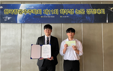 항공우주공학과 김동남·김주영(17학번) 학생이 6월 30일 개최된 한국항공우주학회 주관 ‘제11회 학부생 논문경진대회’에서 최우수상(1위)을 수상했다(지도교수 박동훈).